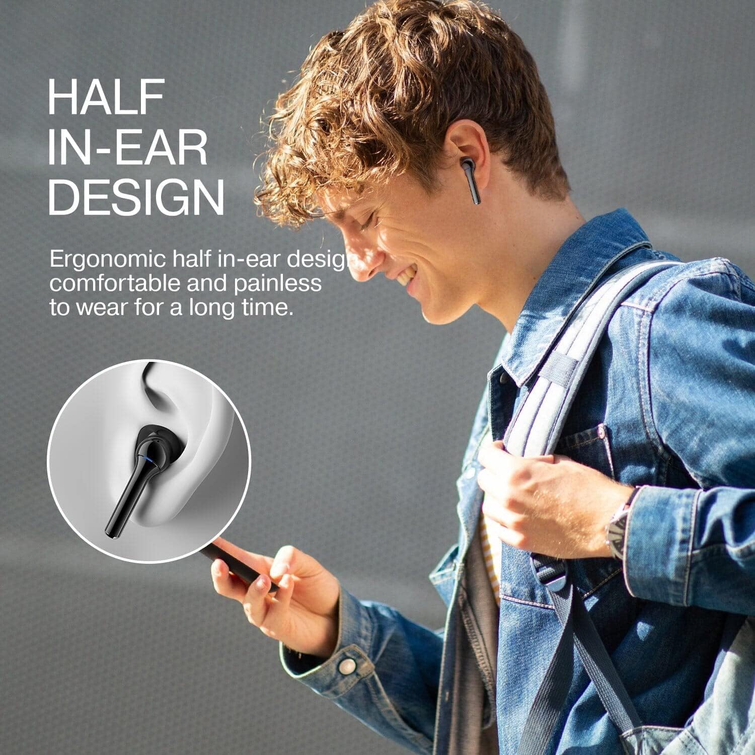 Gently insert the earbuds into your ears, ensuring a comfortable and secure fit. The half in-ear design is crafted for extended wear without discomfort.