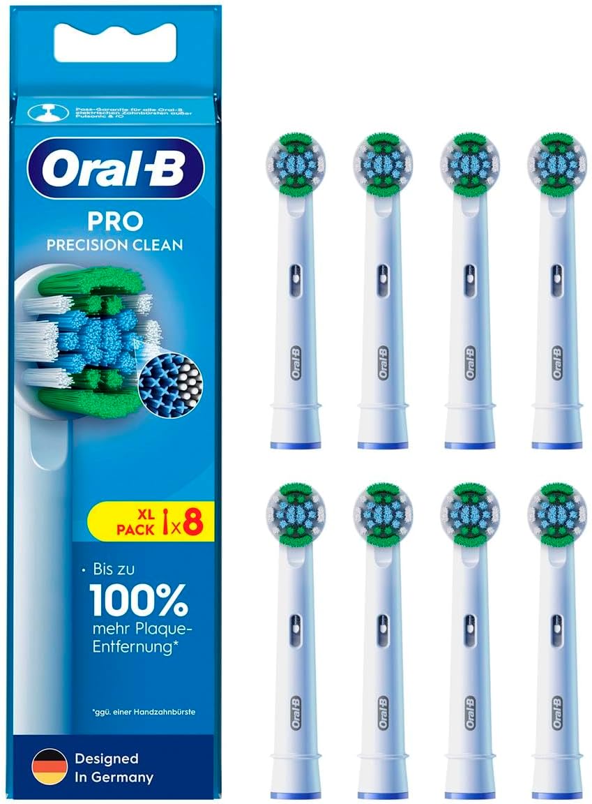Image: Oral-B Pro Precision Clean Replacement Toothbrush Heads, showing the product packaging and the eight individual brush heads included in the pack.