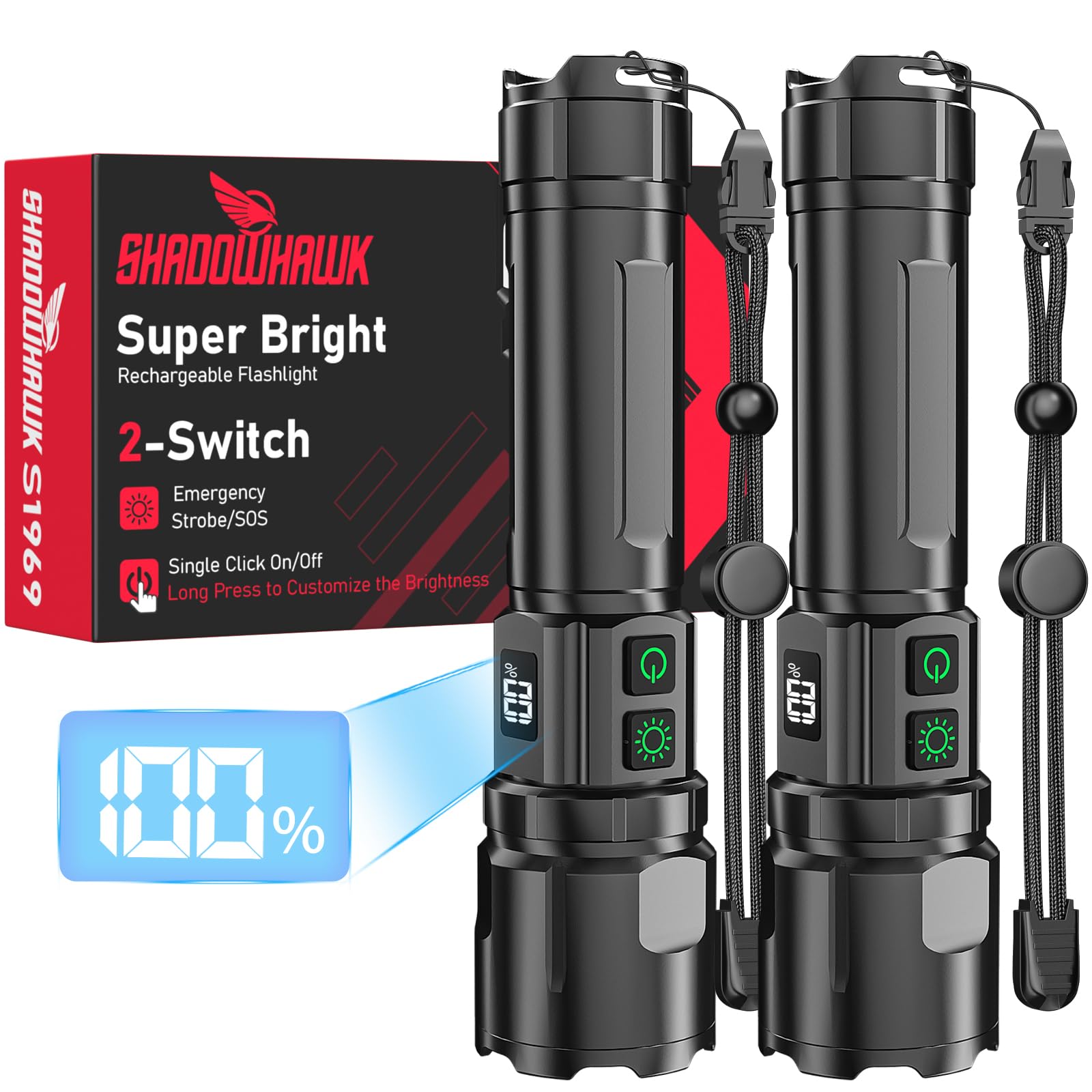 The Shadowhawk S1969 is a high-performance LED torch designed for various applications, including camping, hiking, outdoor activities, and emergency situations. It features an advanced XHM90.2 LED chip, dual switch operation, an LCD battery display, and a robust IP67 waterproof and dustproof design.